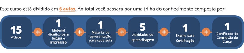 Lembre-se de que os vídeos devem ser assistidos até o fim para que o exame para certificação seja liberado. Ao final, você terá uma avaliação com média 7,0. Ao atingir a nota, você receberá o certificado de conclusão de curso.